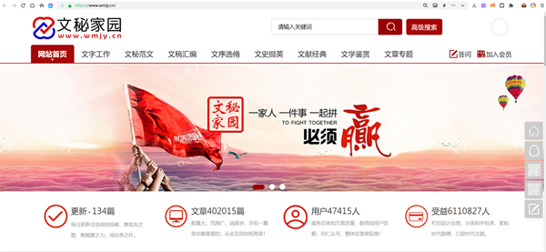 为适应日新月异的形势发展需要,2003年我们创建了文秘家园网站,后来更名为文秘家园,经多次网站系统升级和界面改版,目前共计设置有七个频道、68个一级栏目、1320多个二级栏目、30多万篇文章、几十亿字的文字资料,拥有几万会员。无论是篇幅数量、文稿质量、更新速度、响应时间、服务态度都受到广大会员的一致好评和高度赞扬。