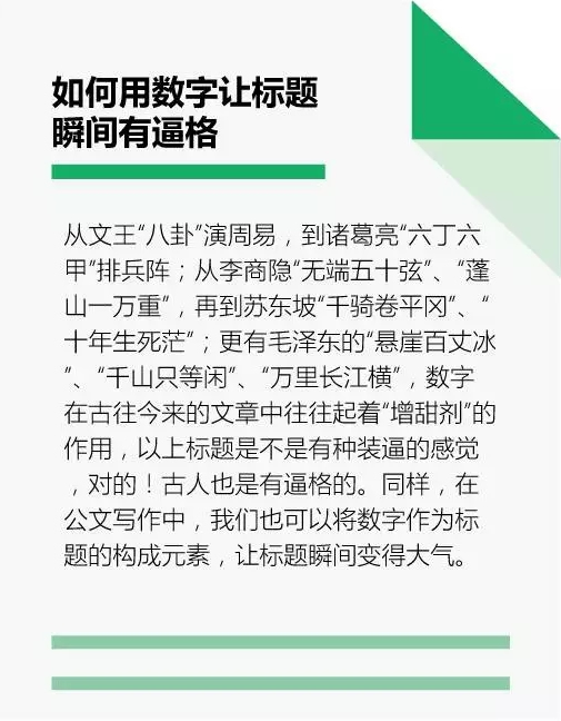 比如我们要写几个关于做好工作的措施,发现相加等于3个,标题就变成《三大举措,推动XX工作》。所以我今天主要想给大家讲讲如何写数字类的二级标题。