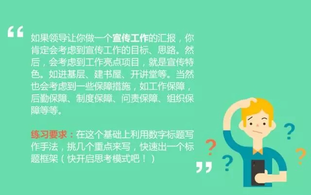 相信看过上面两部分的朋友,对标题的两大类型,二级标题的写法也有了了解,关于如何把标题的字用好,结构弄巧妙这个还是得看具体工作,下面为练习掌握部分,请大家认真参与。