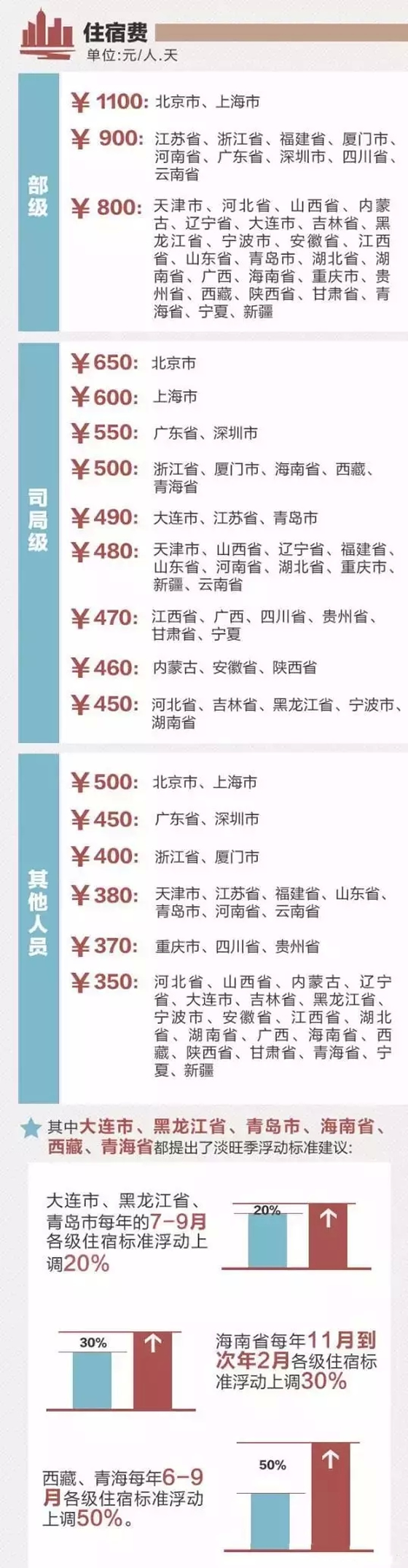 一、住宿费:部分城市提高标准,青岛拉萨等分淡旺季
