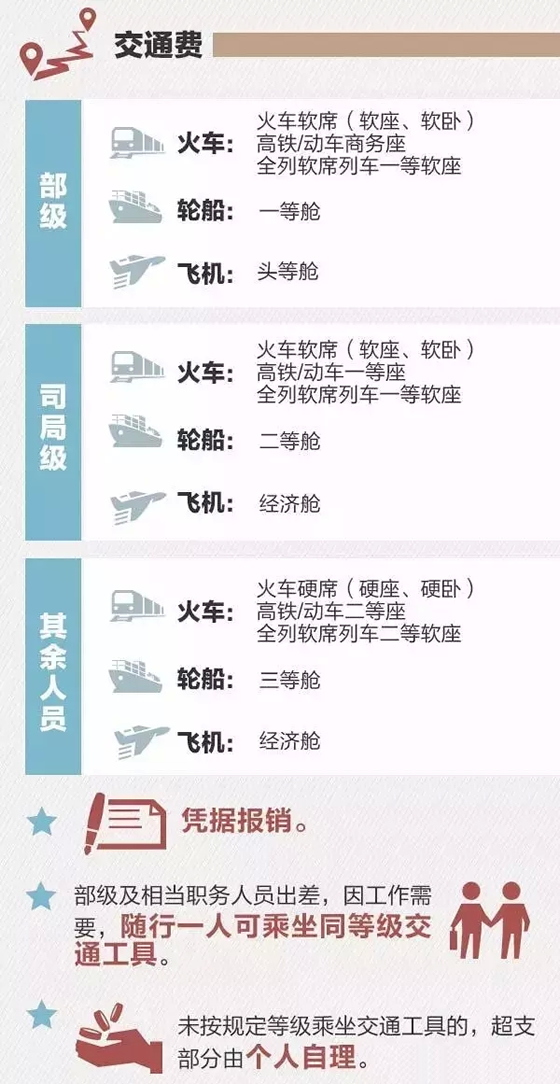 如果坐飞机出行,省部级干部才能坐头等舱,司局级和其他干部只能坐经济舱。乘坐火车的情况稍微复杂一些,县处级及以下干部只能坐硬座、硬卧,高铁二等座等。需要提醒的是,如果“超标”乘坐了交通工具,比如县级干部坐了飞机头等舱,那么差价需要自己补上。