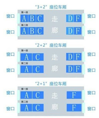 高铁座位分布图座席排号从车厢1位端开始按顺序编排,用阿拉伯数字表示。座椅位置采用A、B、C、D和F五个字母来表示,如:3+2座椅排列中,3人座椅用A、B、C表示,分别代表靠窗、中间和靠走廊位置,2人座椅用D、F表示,分别代表走廊和靠窗位置;2+2座椅排列(包括二等座/餐车的座椅)分别用A、C和D、F表示;2+1座椅排列分别用A、C和F表示;1+1座椅排列(包括二等座/餐车的座椅)分别用A和F表示。即无论何种排列,A、F都代表靠窗座席,B代表中间位置,C、D代表靠走廊座席。