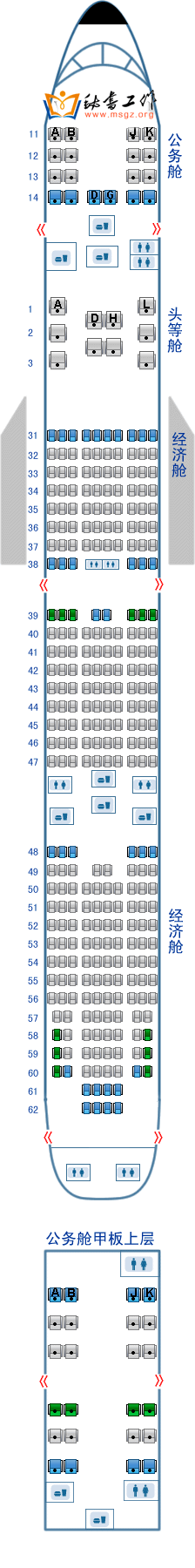 座位间距 座位宽度 座位类型 头等舱: 157.48CM 53.34CM 平板座椅 公务舱: 106.68CM 48.26CM 平躺座椅 公务舱: 86.36CM 45.72CM \
