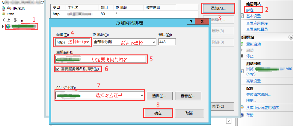 选择要部署证书的站点,编辑绑定,按图所示添加部署。