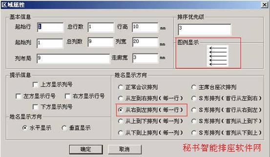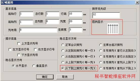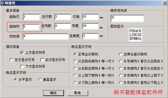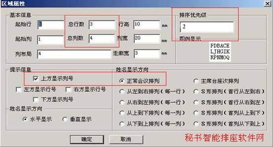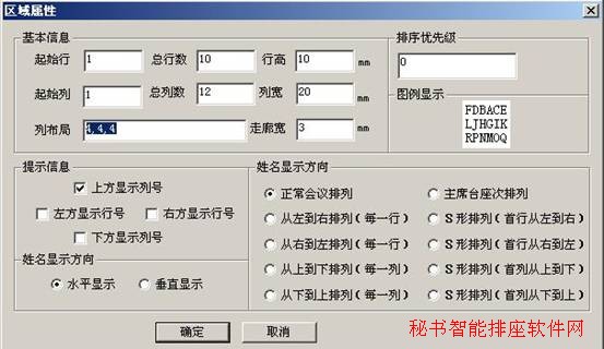 把鼠标移到下面的空档处,点击左键并按住左键不放松拉一方框,出现一个区域设置属性。一般来说,起始行、起始列不变;总行数和总列数根据您会场的布局进行设置,如果姓名是水平显示,那么行高和列宽也可默认;如果您分了多个区域来设置,那么在这里您需要设置排序优先级,数字越小越优先;列布局是指您的会场分了几个大列,比如会场是15列两个过道,那么在这里就设置的5,5,5。如果是12列一个过道,就设置为6,6。如果是12列两个过道,就是4,4,4。也是过道中间有几列座位,列布局数相加必须等于平列数。