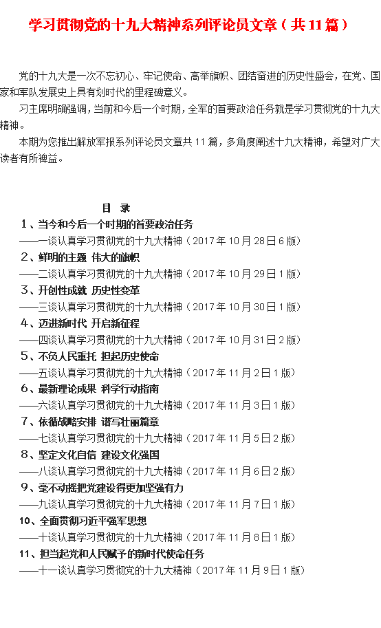 本期为您推出解放军报系列评论员文章共11篇,多角度阐述十九大精神,希望对广大读者有所裨益。
