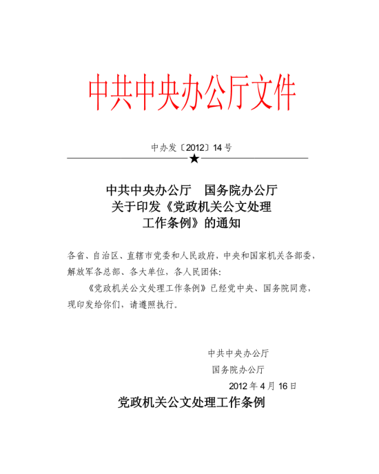 《党政机关公文格式》国家标准和《党政机关公文处理工作条例》(中办发〔2012〕14号)