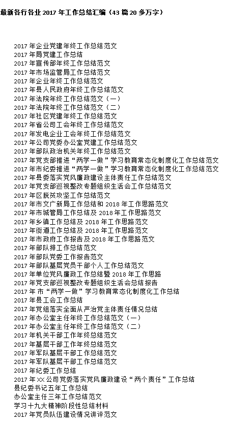 最新各行各业2017年工作总结汇编(43篇20多万字)