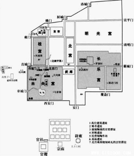 如图:汉初的长安城就是典型的城堡建筑,城墙内部只有宫殿而无任何贸易集市和平民住宅,在当时,“市”和平民都是在城外的。直到后来随着城市规模的扩大和预防游牧骑兵劫掠的目的,才将集市和平民住宅用一层或多层城墙包裹起来,形成了后来的“城市”,这个过程直到宋代才真正完成。