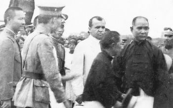 1924年7月23日,孙中山先生在广州东较场参加巴富罗夫追悼会,左起程潜、吴铁城、马坤、廖仲恺、孙中山、邓彦华。黎民伟摄