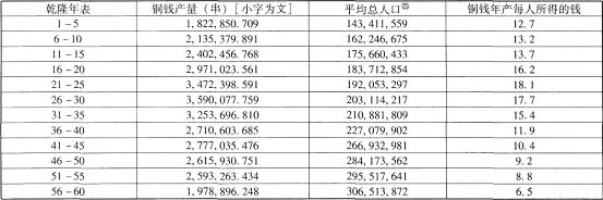 在乾隆朝的六十年里,人口数量翻倍。铜钱的生产量在最初的30年里几乎翻倍了,但是到乾隆末年跌到了它开始时的水平。那意味着在乾隆皇帝退位时,大众人口的财富仅是三十年前的三分之一,相当于乾隆朝初期时的一半。对于一个商人来说,如果他用750文(值一两白银)买的货物800文卖出去,或是用950文买的东西1015文卖出,没有什么关系。然而,铜钱重新进入流通领域总是用来购买东西或服务的,对于很多普通的中国人来说这样的交易与他们的日常生活息息相关。
