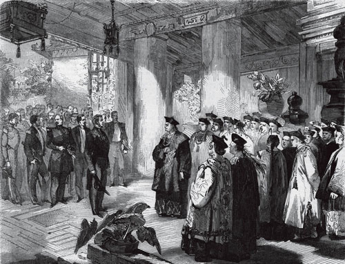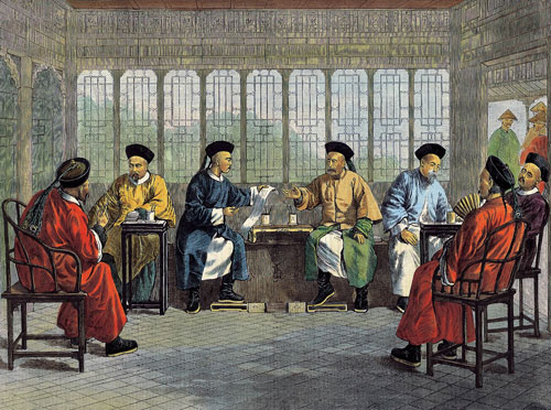 1860年,恭亲王奕在礼部会见英法联军代表,清廷被迫签下《北京条约》的情景(铜版画)