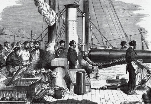 1858年,英国军舰在广州珠江上炮轰清军设在沿岸的防御工事(铜版画)
