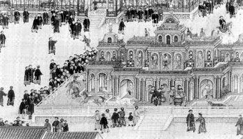 二是巡幸无度。乾隆在位期间,六次南巡,七次东巡,五次西巡,至于近畿京郊,车驾时出,数不胜记。凡巡幸所经,虽有赈济灾民、治理水患等惠政,但供需之侈,费耗之巨,亦是人所共知的。如每次南巡,随行人员多达2500多人,在车驾往返5800余里的行程中,陆路用马五六千匹,大车百余辆,水路用船千余艘。而巡幸的准备工作,早自前一年便开始进行,并由亲王任总理行营事务大臣,负责勘察道路,修桥铺路,修葺名胜和兴建行宫等等。排场上极尽扬厉,饮食上也相当讲究。