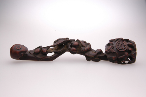 如意——该词出于印度梵语“阿娜律”。形状像长柄钩,钩头扁如贝叶。最早之如意乃讲僧持之记文于上,以备遗忘。始时如意造型为柄端作手指之形,以示手所不能至,搔之可如意。我国民间历来将如意作为吉祥之物,常用作礼品。明清时是如意的鼎盛时期,如意的实用性被淡化,成了苛究工艺与用料的玩赏之物。