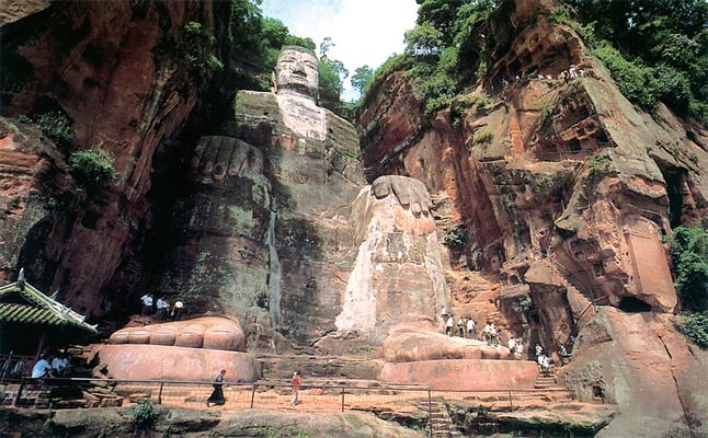 唐德宗贞元十九年(803),乐山大佛造成。它是世界上现存尺度最大的石刻坐佛像。乐山大佛位于今四川省乐山市东面岷江、青衣江、大渡河三水交汇处的栖鸾峰下,依凌云山山崖开凿而成。唐玄宗开元元年(713),由贵州籍名僧海通募款动工,海通逝世后,由剑南西川节度使韦皋舍俸钱50万继续兴建,历时90年完工。乐山大佛高大无比,在极远处,人们便可见其隐没在云山雾海之中。它可远眺峨眉山,近瞰乐山市,作为世界上现存早大一尊摩崖石像,它拥有“山是一尊佛,佛是一座山”之美誉。乐山大佛充分体现了我国古代劳动人民高超的佛雕艺术。