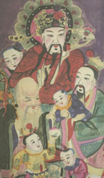 最初他发源于先民对木星的星辰自然崇拜。西汉以来,他是保佑丰收的赐福星官---岁星。但唐朝时,太岁神的凶险一面被过度传扬,大大削弱了岁星的赐福意蕴,人们转而把纳福迎祥的愿望寄托在一位人间好官阳城身上,认为他就是福星下凡来救苦救难。明清以来,道教神系中的天官后来居上,最终成为人所共认的赐福天官---福星。
