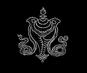 盘腿端坐的佛之身。八宝中的宝瓶与格鲁派用于掣签的金瓶形状相同,但内涵不一。金瓶用以遴选活佛的灵童,而宝瓶则标志着聚满千万甘露,包罗善业智慧,满足众生愿望。八瑞相的组合图案最多,有横、竖、圆、方等多种。有的图案中可以省去宝瓶,用其余七种组成宝瓶以代之。