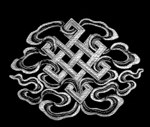 吉祥结,代表佛陀之手,从汪洋般的宇宙中打捞起智慧的珍宝,也代表生命无始无终,佛法回环贯彻,标志佛智圆满,佛智即五智:法界体性智、大圆镜智、平等性智、妙观察智、成所作智。除了印度起源说以外,有人认为它原是牧民挂在腰间的一种饰品,后来演变成为服装、法器、建筑等方面的装饰品,用材上也变为金属、木质、泥制、瓷绘等,并赋予了祥和、团结、和睦等多种意义。据说吉祥结和巴扎图是不一样的,前者所打的结只用一根绳,而巴扎则是三根绳,二者的图案也不同。