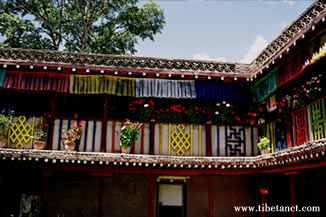 阁楼每层都延伸出一丈多宽的屋檐,檐下是一道长廊,长廊间的明柱、花栏、门窗都十分醒目,而且房子的主人对所有露在屋外的建筑物都会给以精心的彩饰,既有着民居传统的装饰,也有寺院建筑的装饰特点,显得华贵典雅。还有那些屋顶正面用小灰瓦拼出连串的花式,还有下面层层叠叠的椽头,远远望去,好象一排排节日的彩灯。圆椽头纯白绘饰象征着白海螺念珠,屋内的绿色大梁象征着珊瑚的福泽,还有阁楼上装饰的那些八瑞吉祥、长方形、正方形、棱形、三角形、六角形、圆形等象征图案,就更是在召唤福泽。