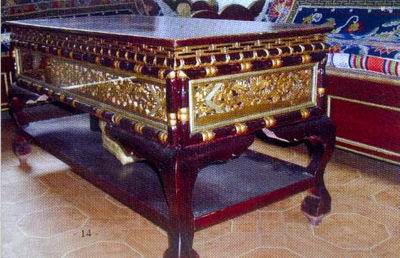 藏桌是西藏家具中出现较早的,它的外形和结构各式各样,目前在寺庙和以前的富贵人家可以找到。藏桌用于吃饭、喝茶(藏茶有酥油茶和甜茶等)、掷色子等;有的被用于×礼仪和特定仪式中;有约桌子还可折叠,便于出去旅游或朝拜时携带。多数的藏桌采用龙或其它怪异件动物、树叶、竹子等为背景图案雕刻或彩绘而成。美而实用的藏桌,体现了西藏家具工匠们的民族雕刻、彩绘于装饰的特殊才艺。