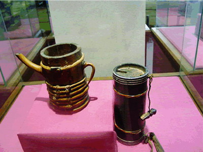 林芝和昌都都是树木繁茂的林区,这些地区的酒器大多是木质的。把木头刨成木片合并在一起形成桶状,然后用滕条绑紧,并且利用木片上的枝桠巧妙地制作成壶嘴。这种酒器是最古朴、最自然的形制。制作完成后,还要用水浸泡一段时间,利用木头在水中膨胀的原理,使木片之间的缝隙闭合。由于林区树木繁茂,这里的人民也普遍酿造青稞白酒,这里流行的温酒器,就极具特色。其形制与一般的酒壶相似,有弯曲的手柄,圆鼓的容肚,还有细长的壶嘴,唯一的区别在于从壶肚内升出的圆柱形炭管。当酒温热后盛入温酒器,再把烧红的炭块夹入炭管中,以保持酒在饮用过程中的温度。这种形制的温酒器据说是从西域一带传来的,但确切的来源尚待考证。