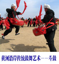 斗鼓是黄河沿岸传统鼓舞艺术中独树一帜的艺术形式,源于气势磅礴的壶口瀑布,流传于宜川县壶口、高柏乡一带。它融舞蹈、武术、打击乐为一体,具有高亢昂扬、粗犷豪放、剽悍威武等特点。3月7日,宜川县郭下村爱好斗鼓的村民自发组织成立了一支60人的斗鼓艺术协会,利用农闲时间排练,为宜川的群众表演,受到了一致好评。图为宜川县郭下村斗鼓艺术协会的会员在村里的麦场上进行斗鼓表演。