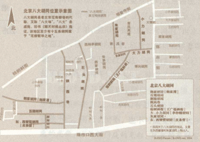 王广斜街灯火明(王广福斜街)。万佛寺前车辐辏(万佛寺系一小横巷,西通陕西巷,东通石头胡同),二条营外路纵横(大外廊营、小外廊营)。貂裘豪客知多少,簇簇胭脂坡上行(胭脂胡同)。”