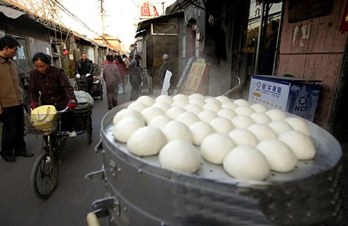 11月11日,在北京市前孙公园胡同,路人骑车经过一个馒头铺。