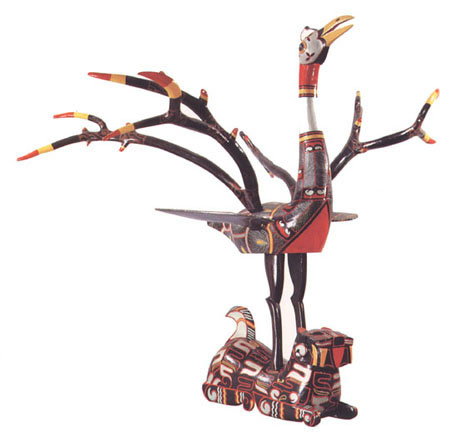 虎座飞鸟是楚墓中出土的一种寓意性雕塑类随葬明器,流行于战国时期,它以生动别致的造型,丰富的文化内蕴,成为楚文物中最富特征的器物之一。器多为木质圆雕,亦有少量陶胎雕塑,一般以蹲伏状的猛虎为座,神态威严,虎背之上立有昂首展翅的长颈凤鸟,仪表轩昂,凤身生出一对锐利的鹿角。
