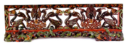 浮雕有众多相互蟠缠的花蛇,花蛇之中有被蜷压其下作挣扎状的鸟首。在有限的空间内塑造出了富有生命力的几十个动物之间的相互争斗壮观场面。图像中所反映的都是自然界中的常见物象,而妙处则在集中组合了空中、地上、水下的动物为一体。座屏雕琢精巧,动物形态各异,栩栩如生;组合层次明朗,穿插交错,变化复杂;整体布局疏密得宜,对称严谨;浮雕与透雕手法并用,细条圆润流畅;纹彩艳丽,髹黑漆为地,又施以朱红、灰绿、黄、白彩漆,光彩夺目,可谓精美绝伦。