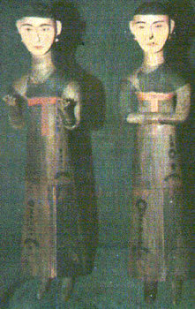 彩绘木俑的头和躯体由整木雕成,足是另外安装的,一件手在胸前作叠交状,和躯干一起雕成,另一件双手在胸前作捧物状,是另外雕刻安装上去的。这两件木俑的形象相同,面部耳、鼻、口全肉雕,而眉、眼、头用墨绘,唇部雕刻后施朱色,十分逼真。从颈项以下,俑的上衣下裳以及身上的佩饰,用朱墨二色绘制。从整体形象看,这两件木俩身材修长,体态文静,面部表情肃穆,并有些显得拘谨。刻与画均传神,将人物恭谨从命,小心翼翼的神态及其掩饰不住的郁闷表现得惟妙惟肖。