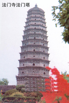 法门寺塔高47米,13层,平面呈等边八角形,全部用青砖砌成,雕檐刻棋。每层叠涩出檐,呈八角柱体,宏伟壮丽,雄视渭阳。第二层以上,每边正中各有一拱形龛洞,每个龛洞内×一尊佛像,共计88尊。第一层正门南向,门上悬“真身宝塔”匾额,正北镶“美阳重镇”匾额。美阳为秦汉县名,这里正是美阳县治旧址所在,唐初贞观年间,改美阳县为扶风县,县治移至今址,将美阳县治旧址从此改为镇,明代又改称崇正镇。塔的第一层西面门额为“舍利飞霞”,东面门额为“浮图耀目”。由于塔的西南不远处有一条大濠,遇雨积水,致使塔身向西南方向倾斜。1981年,塔身半壁倒塌。