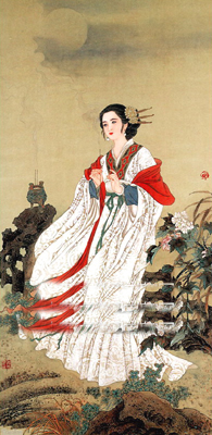 貂蝉的父亲北山郎是一名出色的猎手,一次上山打猎,从恶熊爪下救出一只可爱的玉兔。此玉兔乃上界牡丹仙子下凡所化。她爱慕北山郎为人忠厚,魁梧勇猛,与之在山洞成亲。有孕后采百花精英养育腹内胎儿,致使方圆百里山花野卉无一开放,乡民盛传将有奇人出世。牡丹女临分娩时,正值盛夏,蝉鸣阵阵,一只银貂跃入产房,故将所生女起名貂蝉。后来天帝发觉牡丹仙子私下凡尘,敕令金甲神将其削去正果,化为草木。北山郎采花蕊花露哺育貂蝉,使其出落得百媚千娇。以后她被一名征北将军带到京城洛阳,送给司徒王允做使女。王允为除奸臣董卓,巧设连环计。貂蝉深明大义,甘愿献身,周旋于董卓和吕布之间,使吕布愤而杀了董卓。罗贯中将貂婵女写入《三国演义》中,还有人将吕布戏貂蝉编为戏曲《凤仪亭》,到处传唱。