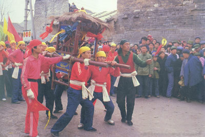尤其是每遇久旱不雨之时,当地群众也会抬出神楼,前边童男童女数人,加上祈雨队伍,形是朝山之状。人人头戴柳圈,抱水瓶者赤身、光足,仰面呼天,希望得到神的保佑,早降甘霖,以救众生。