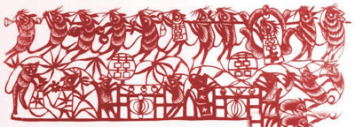 早在南北朝时期,已经出现了于“人日”在屏风上贴剪纸的习俗,开创了剪纸在室内装饰中发挥作用的先河。敦煌莫高窟内发现的装饰纸花是更为成熟的室内装饰剪纸。经过千余年的传承发展,装饰剪纸的品类日渐丰繁。今天,民间剪纸中的挂签、顶棚花、炕围花、灶头花,均属装饰剪纸。 挂签是贴在门媚上的剪纸,上沿贴牢,下面大部悬空,可随风飘动。挂签又叫“挂钱”、“挂千”、“过门笺”。清·富察敦崇《燕京岁时记》说:“挂千者,用吉祥语镌于红纸之上,长尺有飓,贴在门前,与桃符相辉映。其上有八仙人物者,乃佛前所悬也。是物民户多用之。其黄纸长三寸,红纸长寸余者,日小挂千,乃市肆所用也。”山东南部、江苏北部的郯城、邳县等地又有套色挂签,俗称“换堂于”。其法取五色彩纸剪刻成型,局部刻断,各部分相互调换、镶嵌,形成色彩绚烂的装饰效果。 顶棚花是贴在天花板上的剪纸,中央是一张大型的团花剪纸,四角贴上角花。这种布局俗称“四菜一汤”。民间新屋落成。新糊顶棚,以及过年过节、办喜事等都要换贴顶棚花。 炕围花是沿炕周围贴在墙上的剪纸。炕围花的作用不仅是装饰墙面,还具有重要的象征意义。以团花为主的对称布局,造成了很强的向心力;完整的装饰层次加强了室内祥和富足的气氛,暗示着生活的理想。