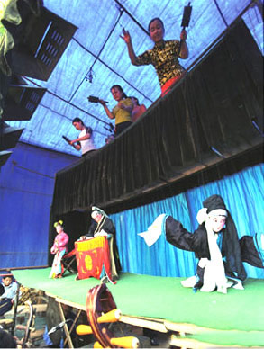 合阳线偶戏过去不只流传于渭北,在晋西南和河南的灵宝一带都极受欢迎。47岁的杨高林是目前线偶团里年龄最大的演员,1973年第一批科班进团。他激动地说,那时候去外地演出经常都是十天半月不回来。“在风陵渡演出时还卖票呢!一毛钱一张。当时那人挤的,里面的人想小便都出不来。”
