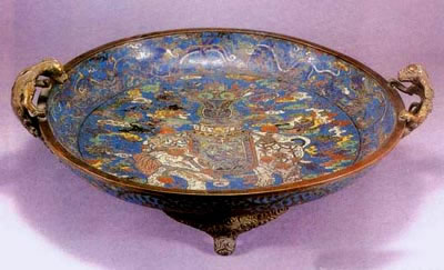 五镀金:将磨平、磨亮的景泰蓝经酸洗、去污、沙亮后,放入镀金液糟中,然后通上电流,几分钟后黄金液便牢牢附首在景泰蓝金属部位上了。再经水洗冲净干燥处理后,一件斑斓夺目的景泰蓝便脱颖而出了。镀好金的景泰蓝再配上一座雕刻得玲珑剔透的硬木底托,更显出景泰蓝雍容华贵、端庄秀美的姿色。