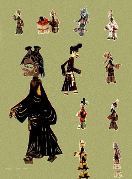 西安皮影戏的人物脸谱有“空镂阳雕”和“实镂阴雕”之分,前面包公属后者,严年属前者。有特称谱,亦有泛指谱。特称谱一刻就就是专演一个人物的眉眼儿,只能演一个“自己”的角色。如:包公、关公、赵匡胤的“头楂”与“桩子”都不可乱配除了他们自己以外的“桩子”与“头楂”。演一般的小生、旦角则可在不同戏目中扮演不同角色,投身不同情节,表现不同性格。又如下面左这个“实镂阴雕”的三花脸丑官“头楂”可配以红色道袍“桩子”,在《激友》中可演“堂儿”,到《秦香莲》中又可演“门官儿”。诸如上中(地方)、右(艄公)、乡约、差役、龙套、銮驾等影子人儿,实在是“万金油”货物,在任何剧目中只要剧情需要,他们都可以做到“召之能来,来之能站”。“影箱”中“万金油”人物多,“专职”人物少;“头楂”多,“桩子”少。其原理与毕升的“活字板”十分相似。“桩子”以服饰表身份地位,“头楂”以脸谱眉眼表个性特点,当然还要配以戏文与“签手”所操动态。百人百性是由皮影戏箱中的“百人十衣”表现的。这样既节省了牛皮和制工,又大大减轻了“箱重”,便於由五人艺班携带登原入山演出!