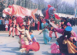 “鱼嬉莲”流传于西安灞桥区水流乡。春节时与龙灯一起组成民间社火队进行表演,由一姑娘手持莲花灯引逗两条鲤鱼灯嬉戏玩耍,寓意“连年有余(鱼)”,表达人们庆贺丰收、欢度春节的喜悦心情。