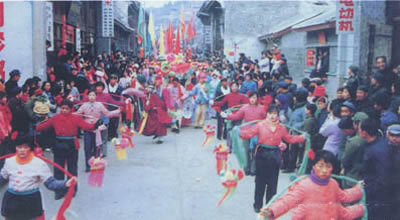 “挑花篮”流传于安康地区旬阳县蜀河镇一带。春节玩灯时常和彩莲船、双人轿车、板凳龙等组成民间社火舞队,活跃在秦巴山乡、汉江两岸。