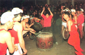 表演上锣鼓时,场地四周燃起堆堆篝火,两社群众高擎火把,照得夜晚如同白昼,虽说是天寒地冻、北风凛冽之时,舞者却赤膊袒胸,只穿一条短裤。每个锣鼓手的脸皆涂成红色、粗眉,有的头插野雉尾,有的头戴草帽壳,还有的戴一副用核桃壳制成的眼镜,也有的胸前戴着护胸罩式的饰物。这种装饰打扮甚为奇特,仿佛让人们看到原始先民的某些形象。表演时人数不限,往往是跳累了,立即有人进场替换,反复表演。场内摆一个高65厘米、直径62厘米的大鼓,表演者围鼓站圆圈,有一人击大鼓,一人击小鼓,数人击大铙、大锣,以及执花环、簸箕者和两个戴大头的和尚。表演至高潮时,大锣手们面对大鼓左脚踏于鼓帮上,不停地向顺时针方向跳转。跳转的过程中,时而右脚蹬地纵身蹬住鼓帮,随即向左转身再跳下,如此不停地上鼓跳转,使表演高潮迭起。