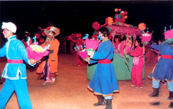 表演时,舞者在伞头的率领下,双平各掫一盏灯,边歌边舞边跑队形。灯具制作精细,造型美观,大都用柳条编架,上糊彩纸,内点蜡烛。常见的有“五谷灯”、“六畜灯”、“龙灯”、“凤灯”、“莲花灯”,以及“十二属相灯”等。但最简便易行和普遍采用的,则是将农村用的土碗,装满沙子,将一把香蘸上食用油,插在碗中点燃应用。