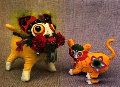 布玩具在民间有许多传统式样,有摆件挂件之分。一般采取简洁明显的方式,形式简约,刻意传神。蕴藏着祈望幸福、美满、欢乐、健康兴旺的思想感情。从中可悟到质朴而又奥妙的“乡土美学”。