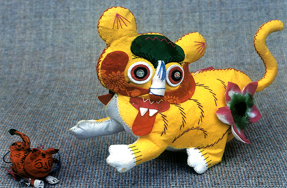 布玩具是儿童所热爱的传统玩具艺术品之一。陕西民间布玩具主要流行在长武、岐山、风翔、城固一带,题材以虎、狮、猪、兔、鸡、猴、骆驼等为多,造型饱满生动,富于想象夸张,色彩鲜艳夺目。制作中艺人们很懂得因材施艺,充分显现材料的质地美和针法的工艺美。往往是利用平时攒积的各种布头、绸片、金属碎片、纸头,经过巧妙地组合、配置,收到奇妙丰富而妥贴的艺术效果。在这些布玩具中,洋溢着母性的慈爱,寓意对儿童幸福健康的祝愿。