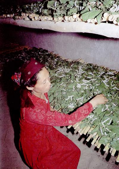 和田地区养蚕缫丝历史悠久,一位×农妇在养蚕。