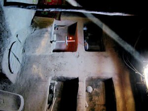推开这扇门,随着一阵灰尘的落下,右侧有一束昏暗的自然光从窄小的天窗射入。买买提·阿不都从我身后挤进,抢先跳上土炕,在土炕侧面的凹进的土桌上,点燃了一盏油灯,那是他爷爷挖坎儿井时用的定向油灯。借着油灯微弱的光,我看到门左面是占了半个房子的土炕,土炕右边缘有一个土砌的圆形灶台,沿土炕一周的墙面上有9个长方形的龛洞,发挥着壁柜的功能,零散地摆着些被褥、杂物、陶罐。