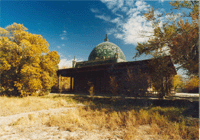 位于哈密市西郊的一块高地上,人称“圣人墓”,又称“绿拱拜”。占地8亩,飞檐拱顶,顶下有24根圆木支撑,拱顶全用绿色琉璃瓦铺砌,四周有50公分高的木栏围起,结构精致,形体威严,远远望去就像是一颗光芒闪耀的绿玛瑙,镶嵌在哈密的绿洲上。