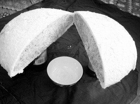王书记指着一道菜对我们说:“尝尝这个,是我们巴里坤传统的特色菜。”我一看,一个大盘子上蒙着一张淡棕色的薄饼,细腻而油亮,似一块缎子蒙在上面,散发出一股诱人的香味。