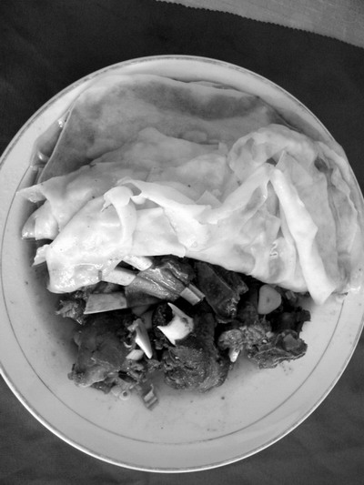 我们就着红烧羊肉,吃着这“巧夺天工”的饼子,味道确实不一般。薄饼入嘴即化,甜丝丝的,加上被喷香的红烧羊肉浸泡,别提那味儿有多香了,真是一吃一个不言传!
